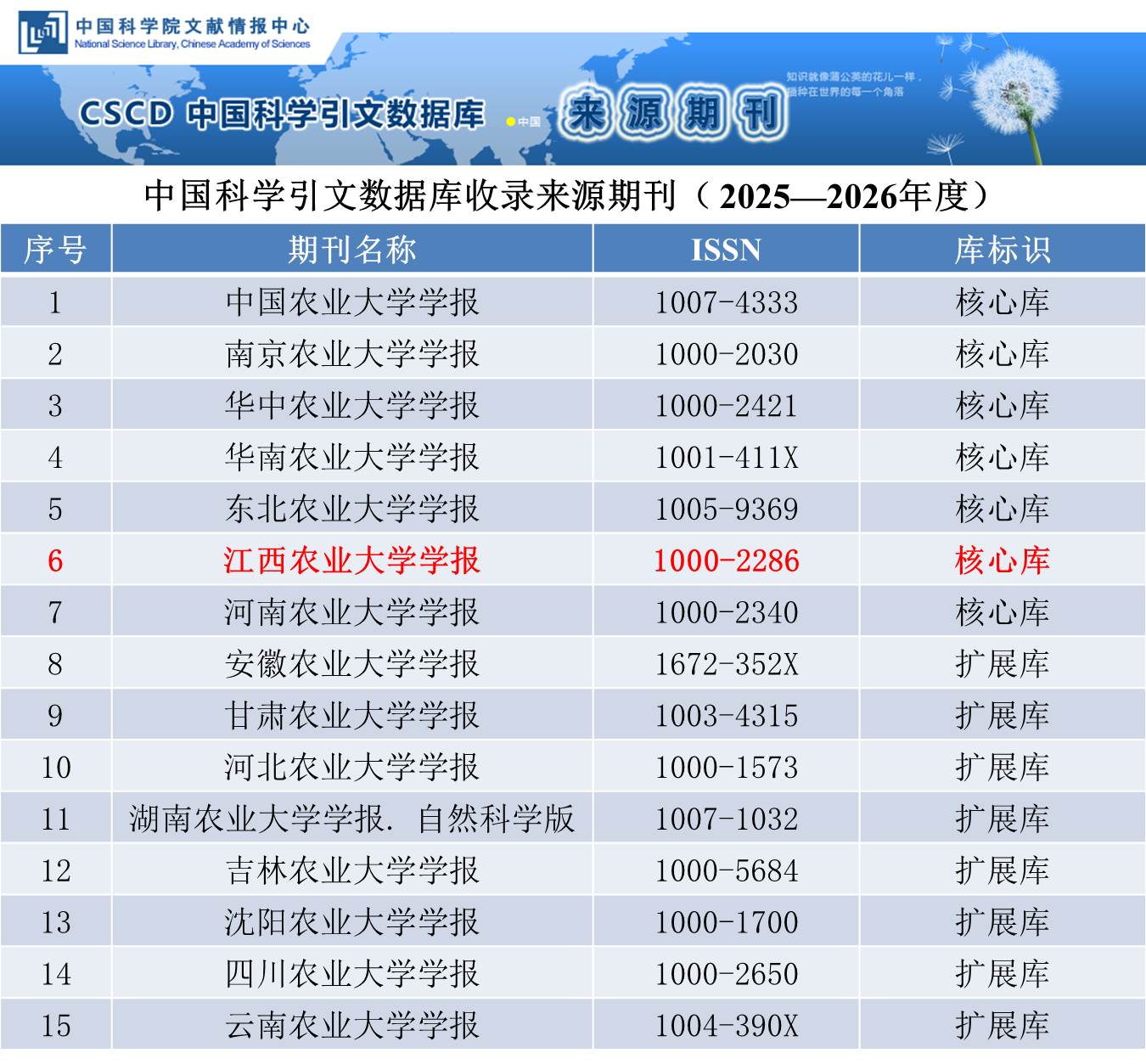 近日,中国科学院文献情报中心发布了中国科学引文数据库(Chinese Science Citation Database,简称CSCD) 2025—2026年度来源期刊遴选结果,《江西农业大学学报》被《中国科学引文数据库(CSCD)来源期刊(2025—2026年度)》核心库收录。这是《江西农业大学学报》连续四次入列CSCD核心刊(2019—2020、2021—2022、2023—2024、2025—2026版),也是江西省唯一中文CSCD核心刊。