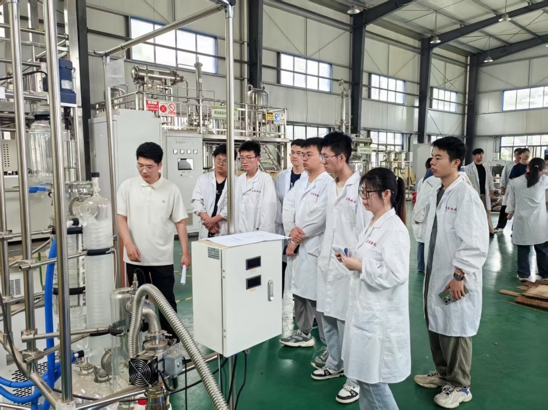 实习过程中,同学们认真听取带队教师的讲解,了解并参与中型生产设备的使用,包括提取罐、压板机、热解炉等;了解林化系列产品(植物精油、松节油、胶合板、生物质炭等)的生产流程;了解生产车间的组织管理制度和安全生产规程,认识安全生产的重要性。