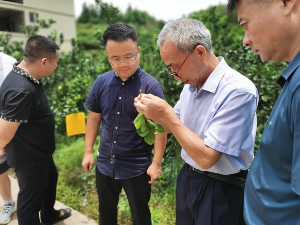 导师团在赖有辉脐橙基地指导导师在查看果树病虫害