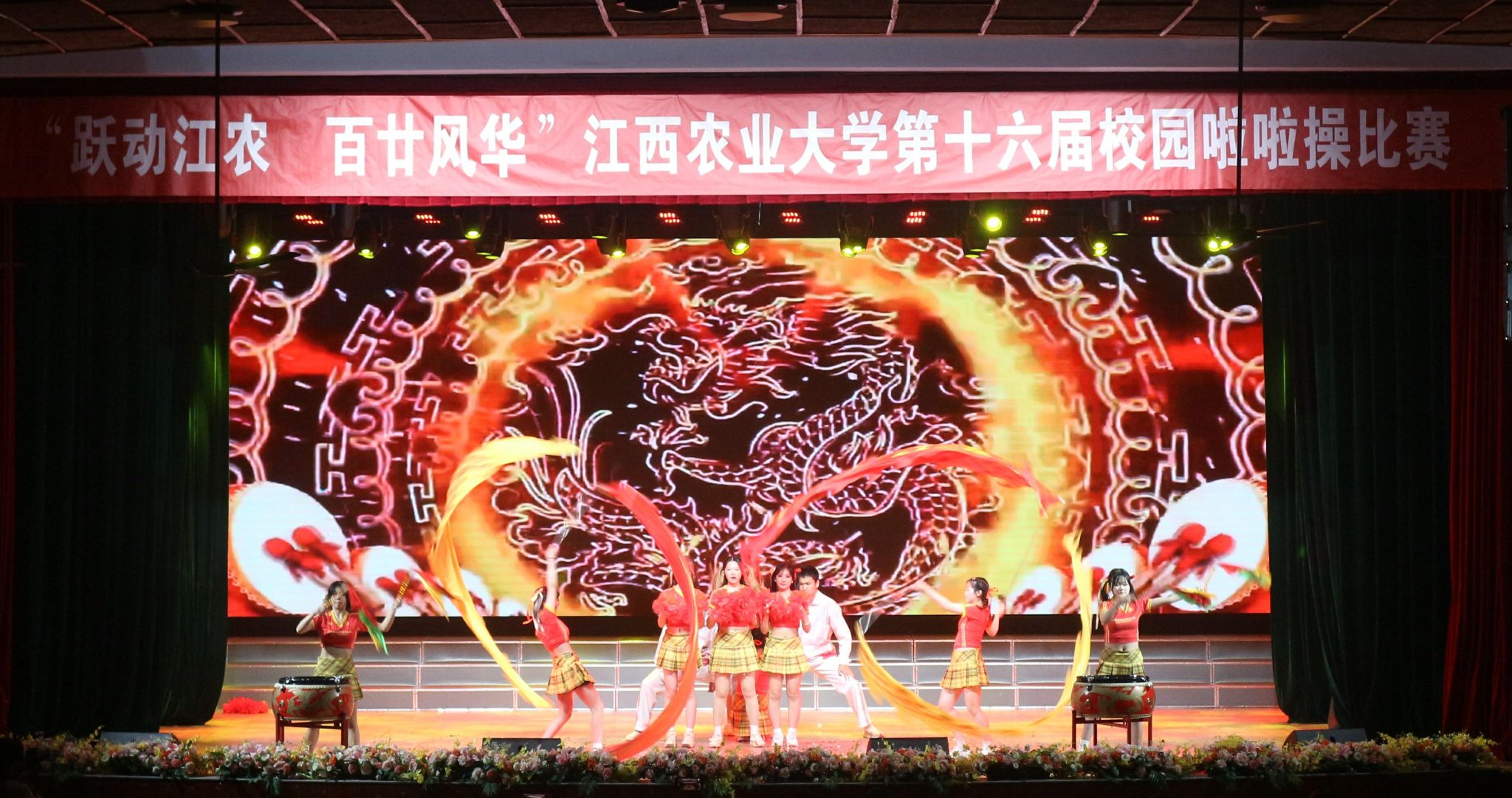 当晚的大礼堂灯火璀璨,座无虚席。伴随着动感音乐,各学院代表队依次登台,以精心编排的啦啦操演绎青春故事。舞步整齐划一,队形变幻如虹,高难度的托举、空翻与极具创意的主题设计引得观众掌声雷动。工学院代表队用机械的精准与工程的力度,演绎“力与美”的融合,为百廿江农"锻造"青春火花;动科院代表队的同学们旋转跳跃如骏马奔腾,似雏鹰展翅,用活力诠释“厚德博学 抱朴守真”的江农精神;计信院的同学们用"代码"编写啦啦操的算法,舞出数字时代的青春逻辑……
