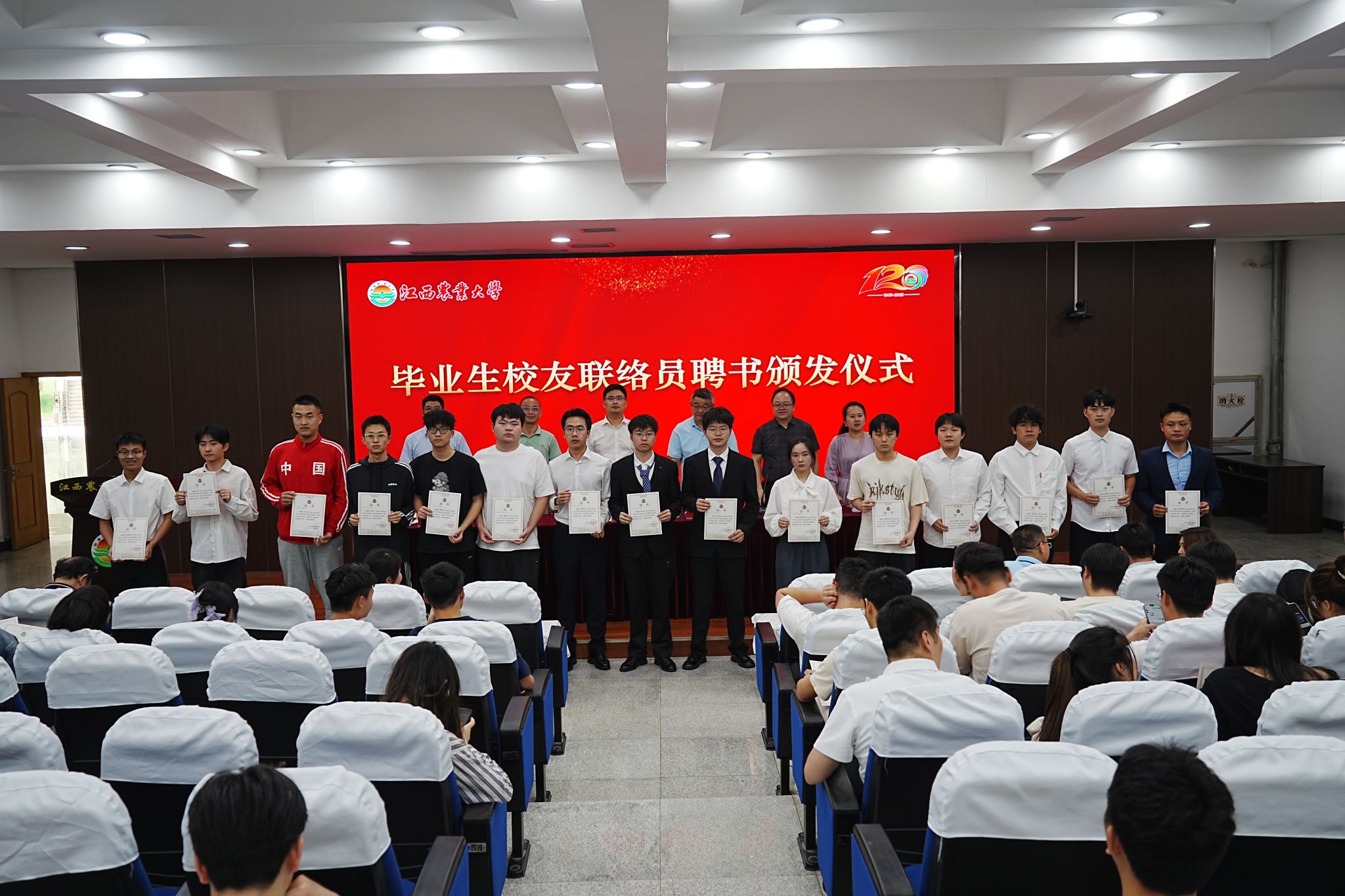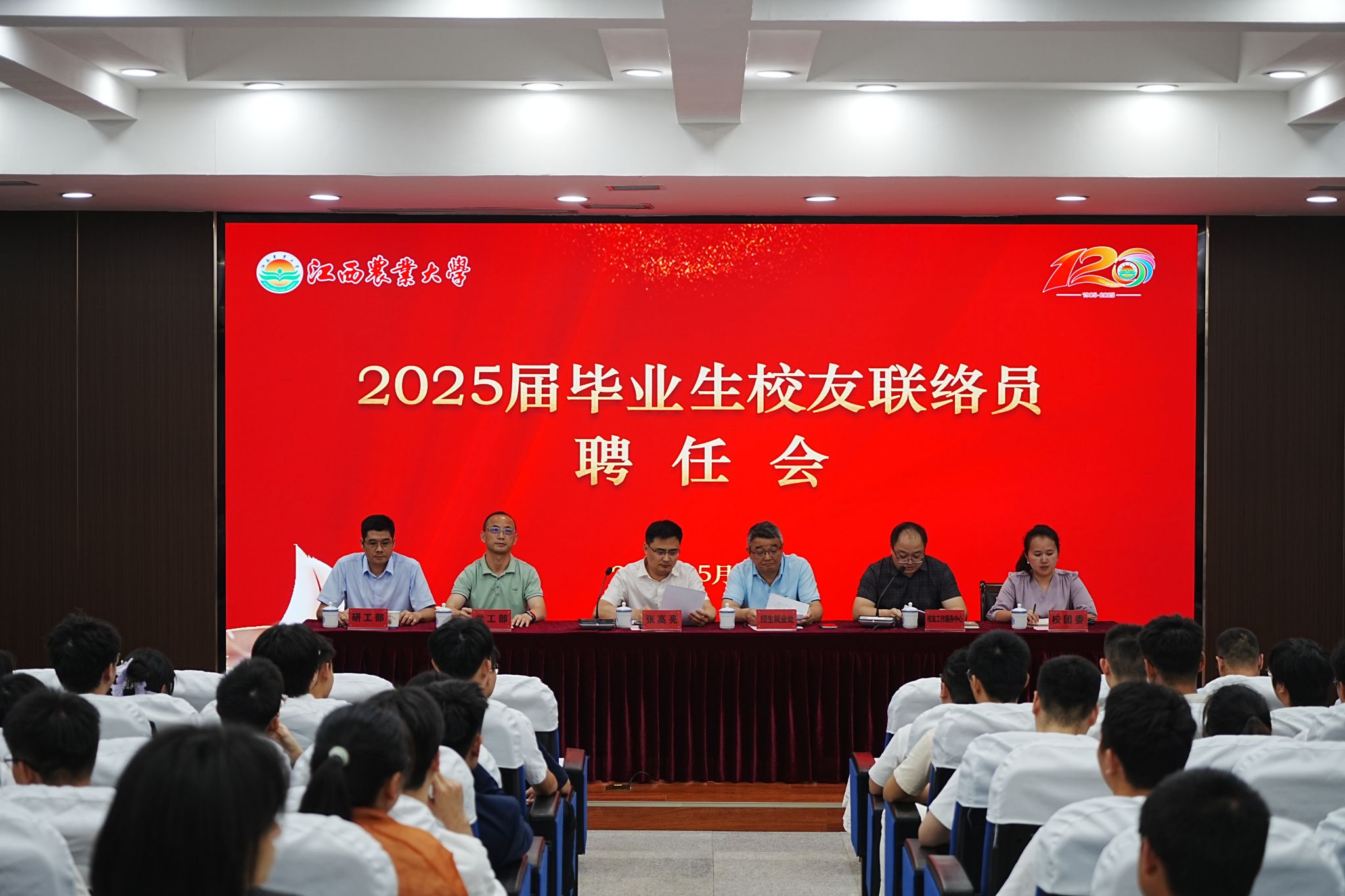 会议在庄严的国歌声中拉开帷幕。招生就业处负责人宣读了《关于聘任江西农业大学2025届毕业生校友联络员的通知》,151 名毕业生正式成为校友联络员。2025届毕业生曹刚、丛超、江集宝作为受聘校友联络员代表发言,表达了对母校建校120周年的祝福和服务校友、奉献社会的决心。周佳慧同学代表全体联络员宣读《2025届毕业生校友联络员倡议书》,共同许下青春行动誓言。校领导与相关部门负责人共同为联络员颁发聘书。