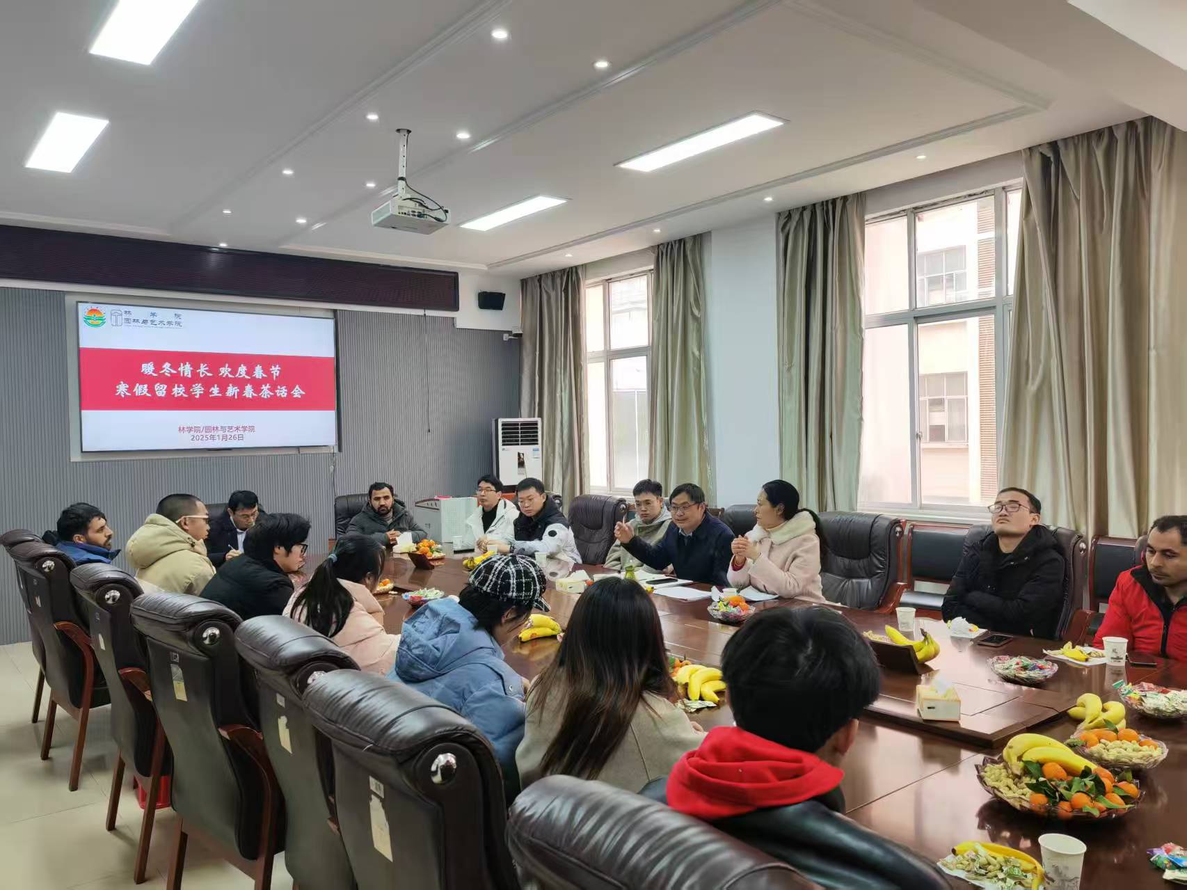 1月26日,农历腊月廿七,园林与艺术学院“暖冬情长·欢度春节”新春茶话会在学院306会议室如期举行。会上,学院院长、党委副书记与留校过年的22名学生亲切交谈,致以节日祝福,同时介绍了寒假期间学院为学生提供的服务保障情况,并再次强调了寒假留校期间学生管理要求和实验室安全要求,希望大家在校度过一个充实难忘、平安祥和的春节。“这是我第一次在中国过春节,我很喜欢这里的节日氛围,学院老师也给了我们细致入微的关怀”来自巴基斯坦的留学生Abbas Ali如是说。